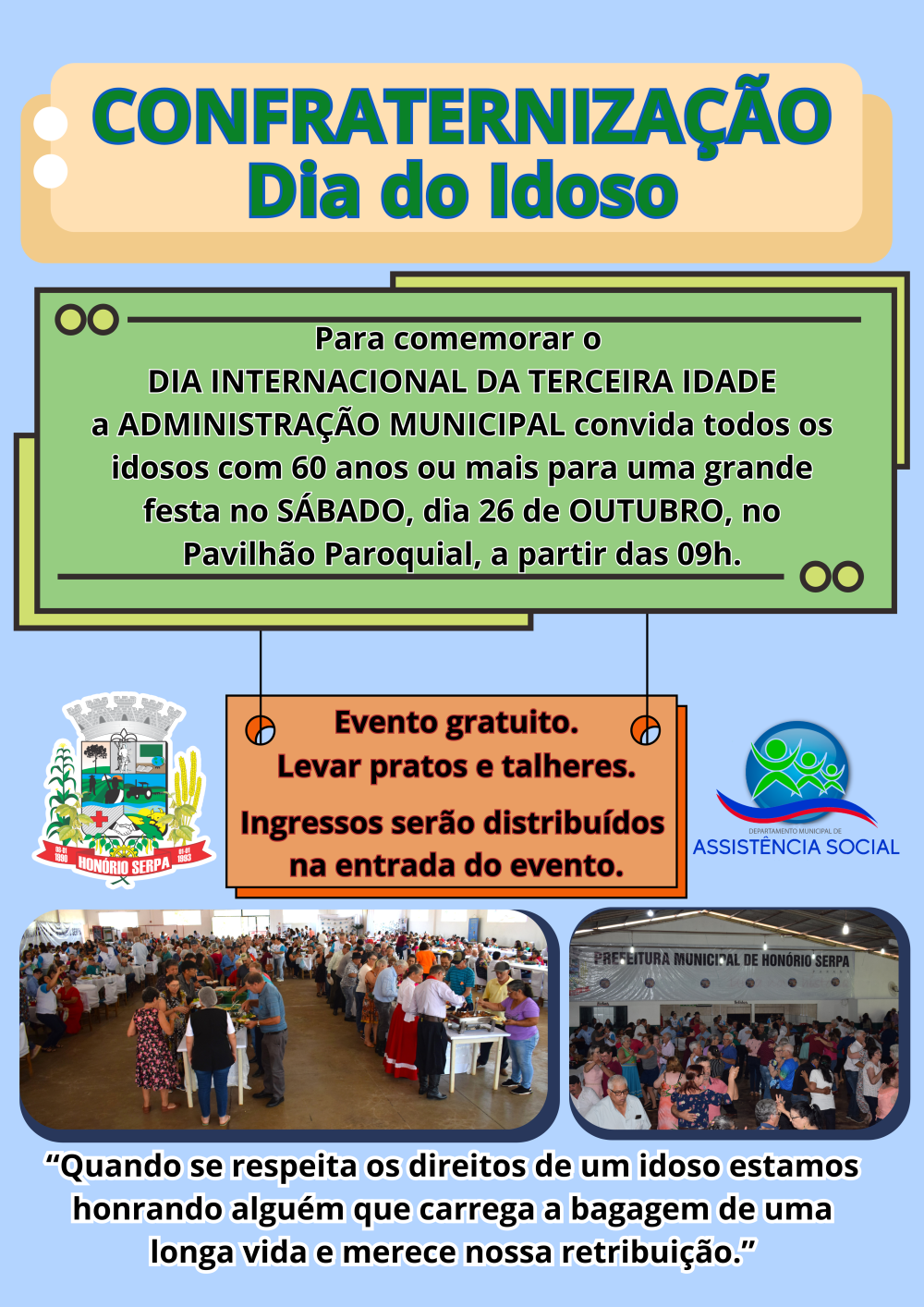A Administração Municipal, por meio do Departamento de Assistência Social, está convidando todos os idosos do município (60+), para a confraternização em comemoração ao Dia Internacional da Terceira Idade. Será realizado no sábado, dia 26 de Outubro com almoço e muita diversão.